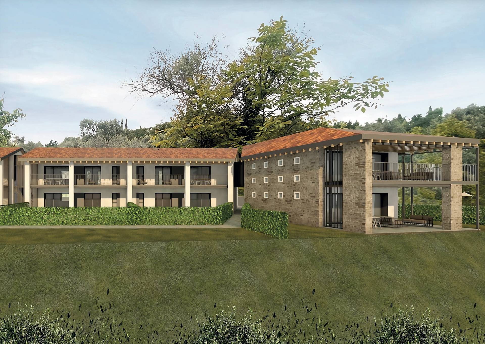Nel cuore della suggestiva Valtenesi, tra dolci colline e vigneti e sospeso sopra il Lago di Garda, nasce "Castelletto Apartments", un esclusivo complesso residenziale di sole 11 unità abitative, immerso in un contesto naturale di grande pregio e tranquillità. Il progetto nasce da un'attenta reinterpretazione dell'antica cascina lombarda, con l'obiettivo di preservarne l'identità originaria e valorizzare al massimo il paesaggio circostante. Le architetture si inseriscono armoniosamente nell'ambiente grazie all'utilizzo di materiali autentici come pietra locale, intonaci tradizionali e coperture a falde con coppi, creando un equilibrio perfetto tra tradizione e comfort contemporaneo. La posizione leggermente sopraelevata regala ampie viste panoramiche sul territorio e scorci unici sul Lago di Garda, fino alla splendida penisola di Sirmione.
